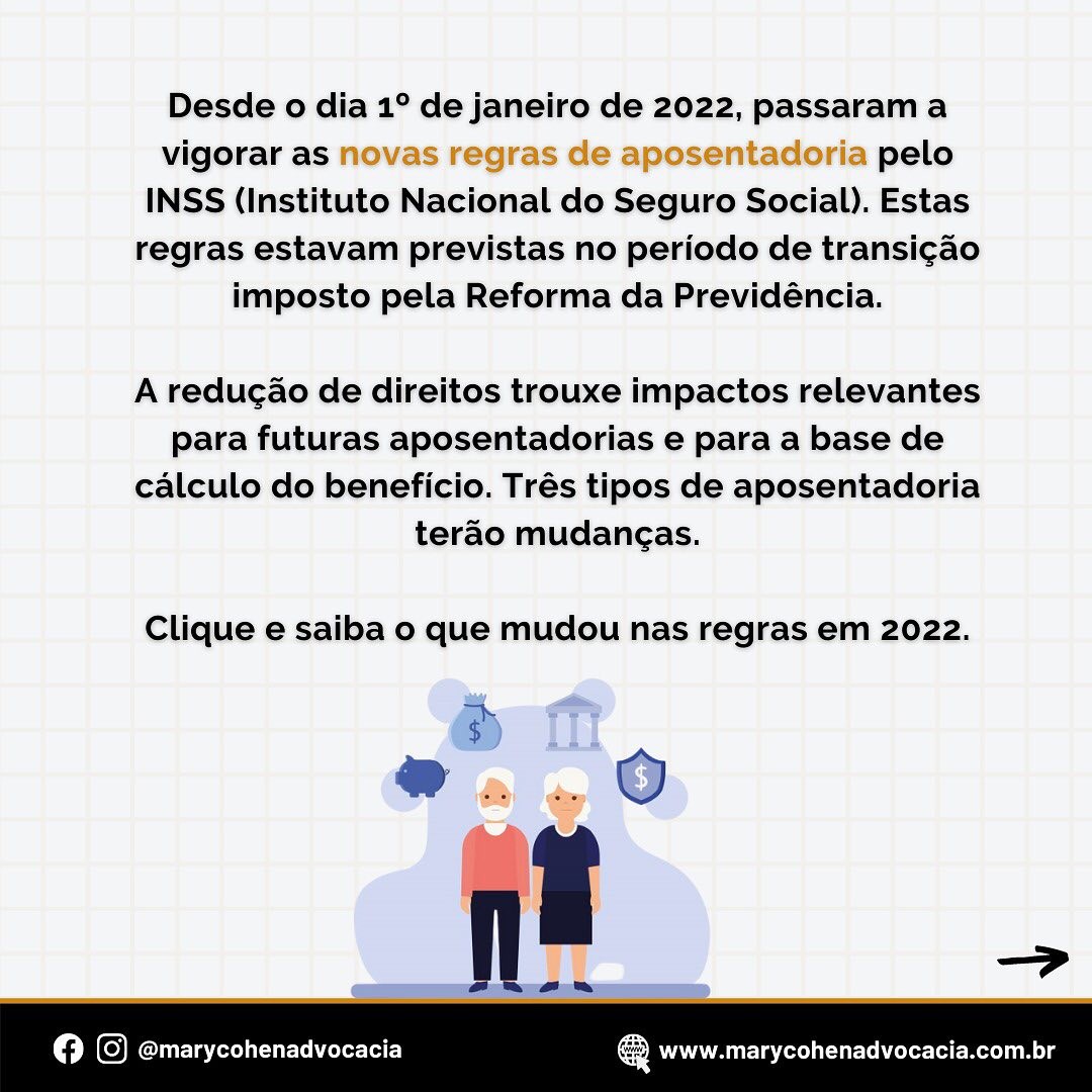 Desde o dia 1º de janeiro de 2022 passaram a vigorar as novas regras de aposentadoria pelo INSS (Instituto Nacional do Seguro Social). Estas regras estavam previstas no período de transição imposto pela Reforma da Previdência.