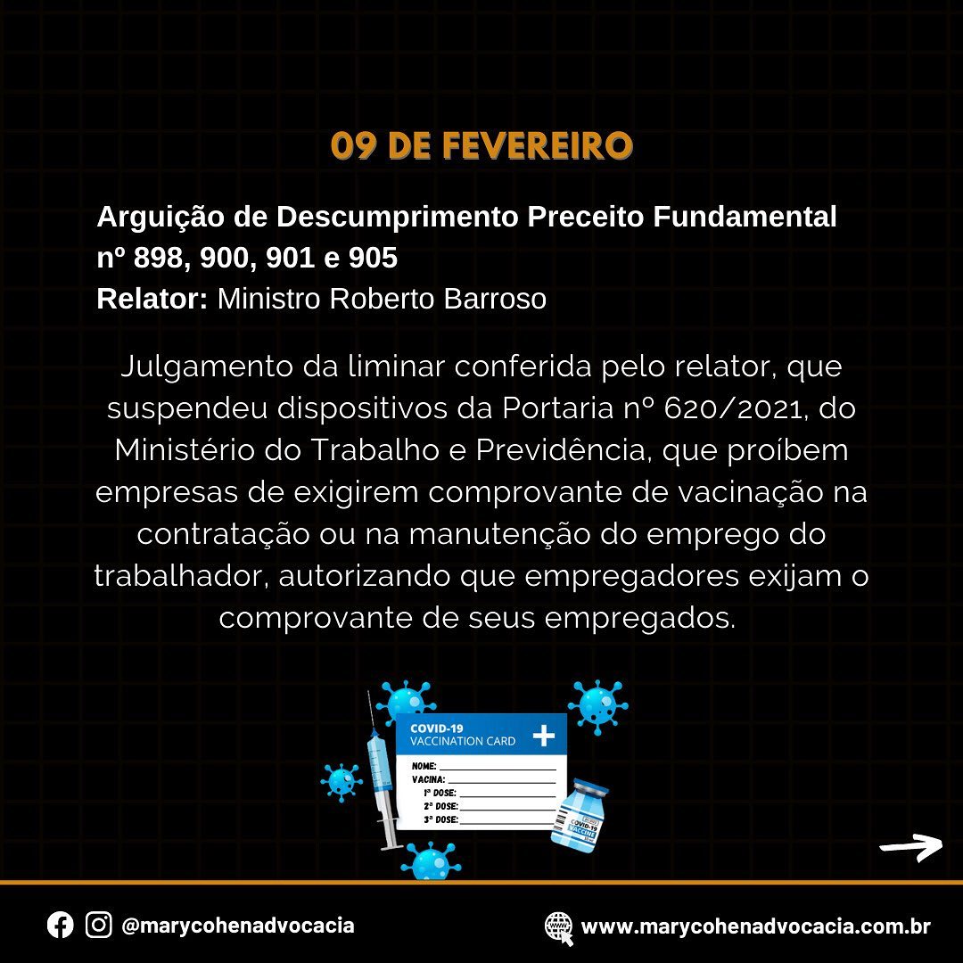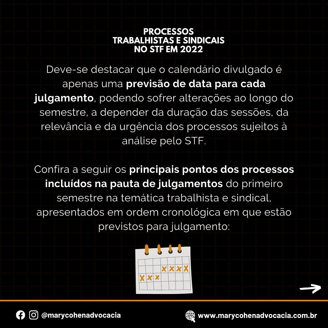 No dia 17/12/2021, foi divulgada a pauta das sessões plenárias do Supremo Tribunal Federal (STF), trazendo o calendário de julgamentos deste tribunal, previstos para o primeiro semestre de 2022.