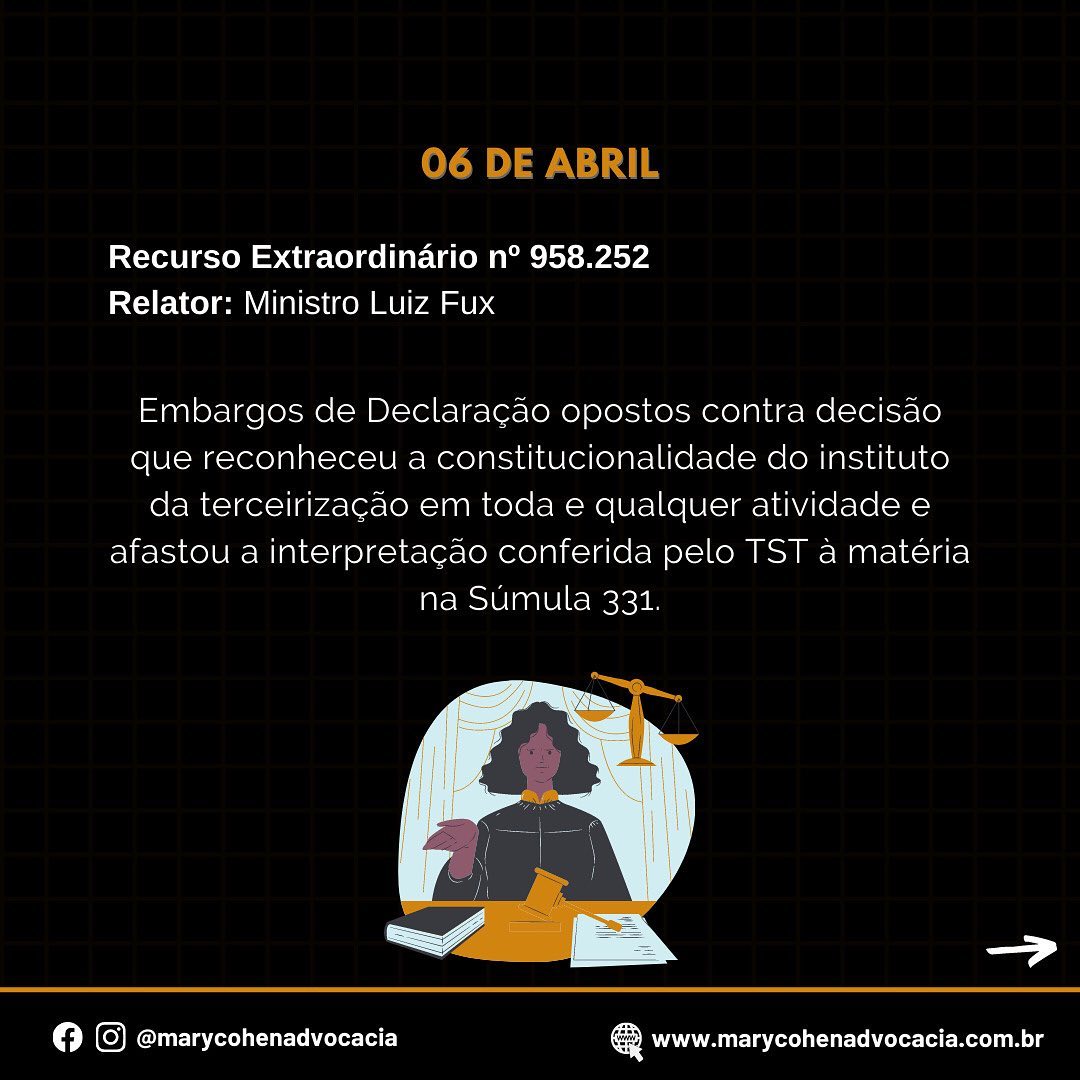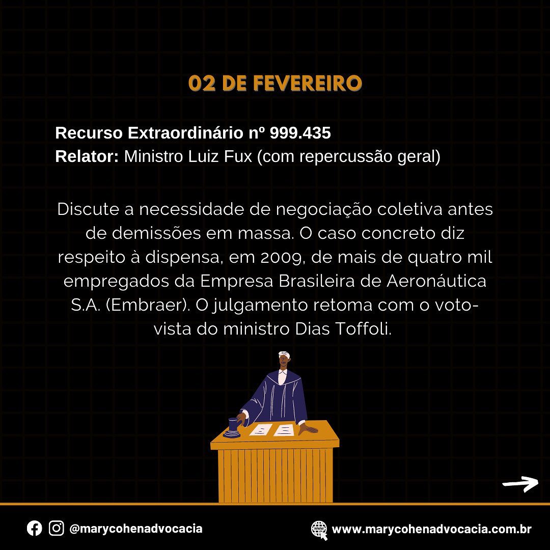 Dentre as matérias, há temas importantes que dizem respeito às relações de trabalho. Como exemplo, tem-se o julgamento acerca da necessidade de negociação coletiva antes de demissões em massa e outros temas da Reforma Trabalhista (Lei nº 13.467/2017).