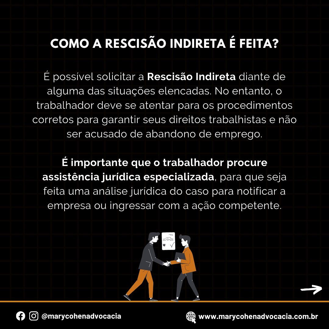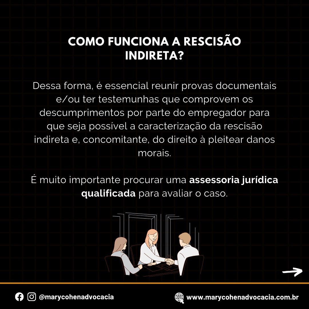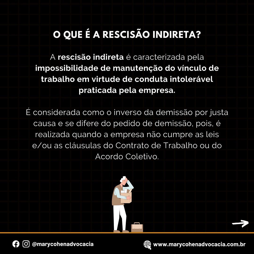 A rescisão indireta é caracterizada pela impossibilidade de manutenção do vínculo de trabalho em virtude de conduta intolerável praticada pela empresa e permite que o trabalhador não se submeta a contratos de trabalho indignos.
