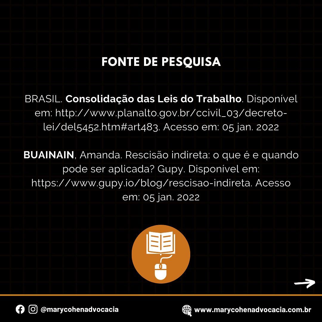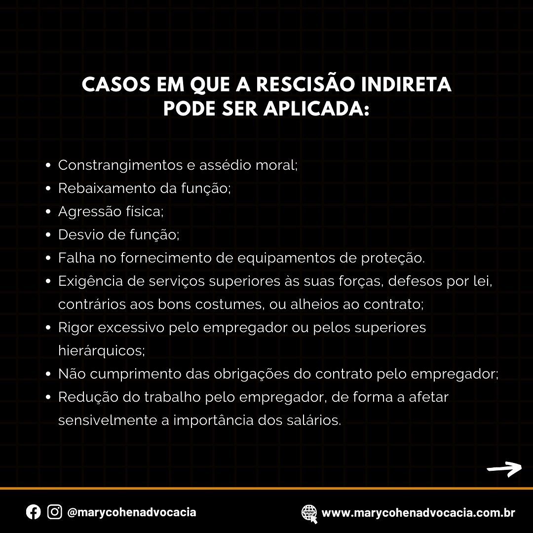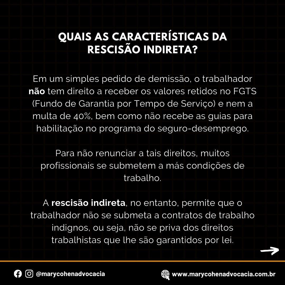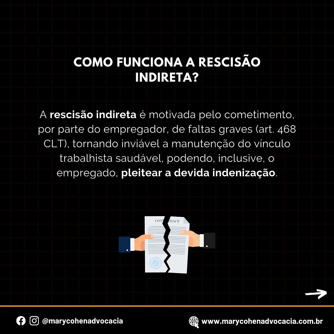 A rescisão indireta é caracterizada pela impossibilidade de manutenção do vínculo de trabalho em virtude de conduta intolerável praticada pela empresa e permite que o trabalhador não se submeta a contratos de trabalho indignos.