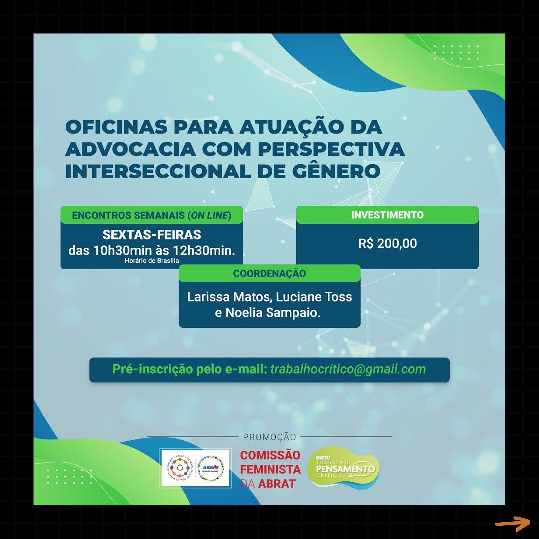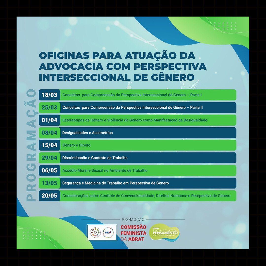 A Comissão Feminista da ABRAT, a Escola da ABRAT e a Escola Trabalho e Pensamento Crítico, com base no Protocolo para Julgamento com Perspectiva de Gênero, lançado pelo CNJ e vasta legislação aplicável ao tema, estão organizando OFICINAS para atuação da advocacia, com perspectiva interseccional de gênero.