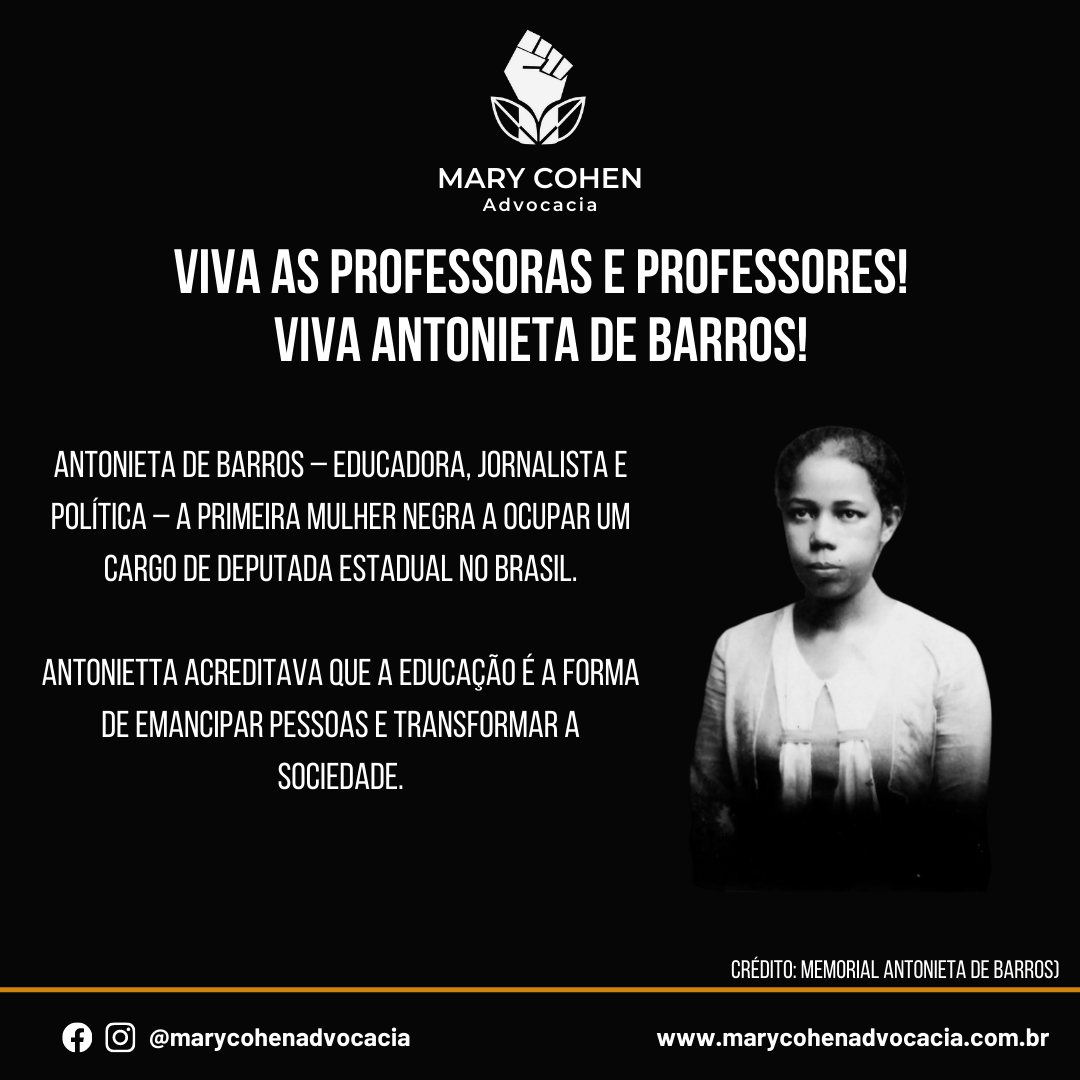Hoje, além de homenagear e agradecer pelo dia de quem é parte imprescindível na construção de um futuro melhor, rememoramos o legado de Antonieta de Barros – educadora, jornalista e política – a primeira mulher negra a ocupar um cargo de deputada estadual no Brasil.