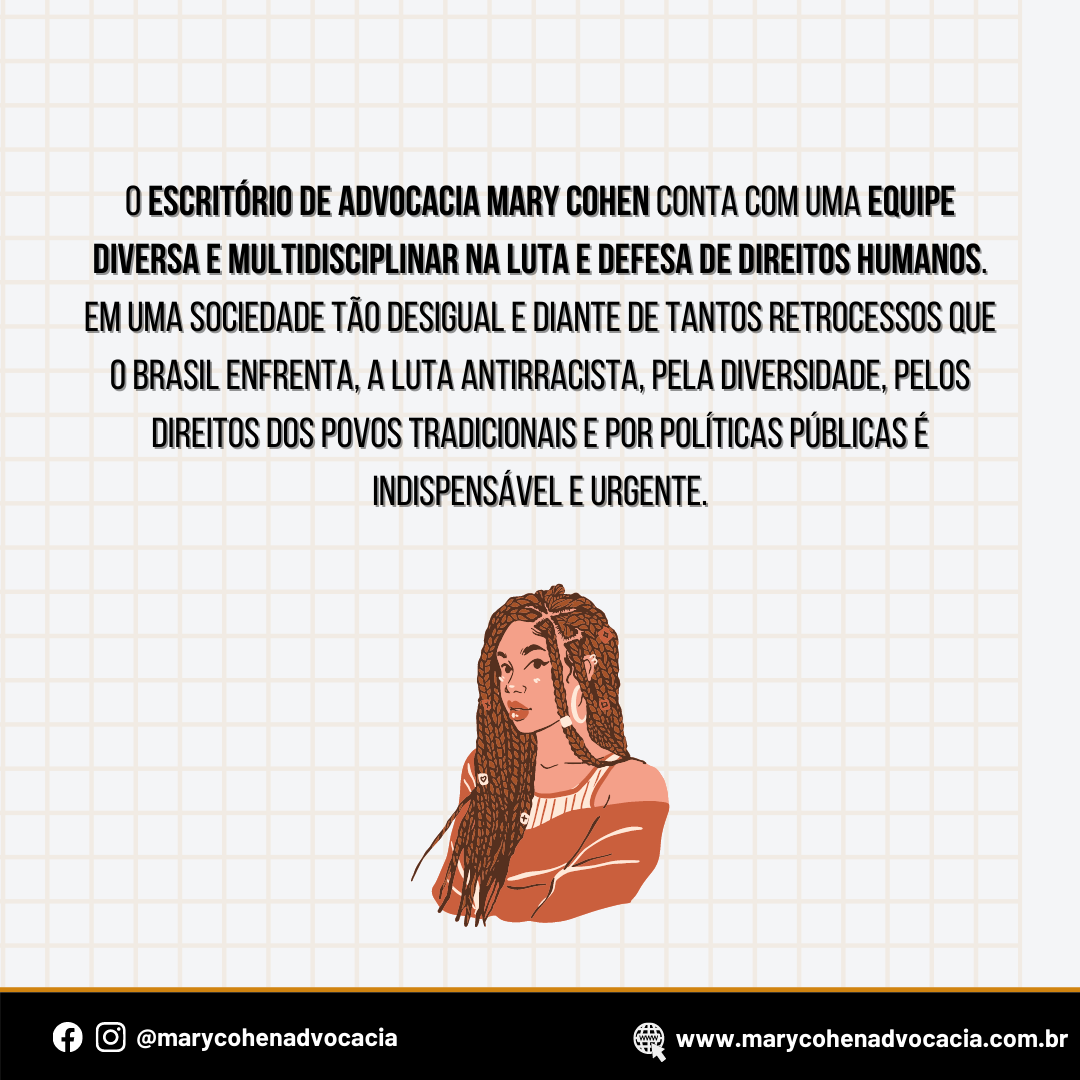 O Escritório de Advocacia Mary Cohen conta com uma equipe diversa e multidisciplinar na luta e defesa de direitos humanos. Em uma sociedade tão desigual e diante de tantos retrocessos que o Brasil enfrenta, a luta antirracista, pela diversidade, pelos direitos dos povos tradicionais e por políticas públicas é indispensável e urgente.